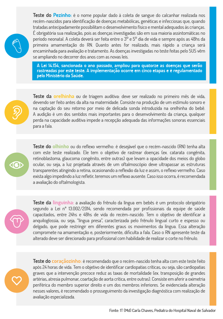 Após os nove meses de gestação, vem o nascimento do bebê e várias perguntas surgem: “meu bebê está saudável?”; “preciso fazer exames?”; “quais exames ele deve realizar ainda recém-nascido?”. E para esclarecer essas dúvidas, será abordado o tema dos testes de triagem neonatal de forma simples e objetiva.