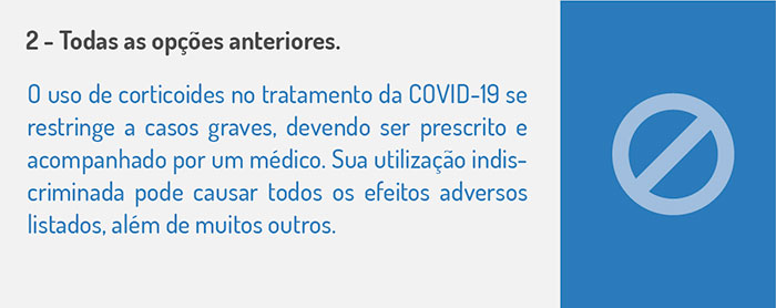 Você ficou sabendo que, em alguns casos de COVID-19, os médicos prescrevem o uso de medicamentos conhecidos com “corticoides”. Mas, ao surgirem os sintomas, você NÃO se automedicaria, porque aprendeu com o Saúde Naval que o uso indiscriminado desses medicamentos sem indicação adequada pode causar: